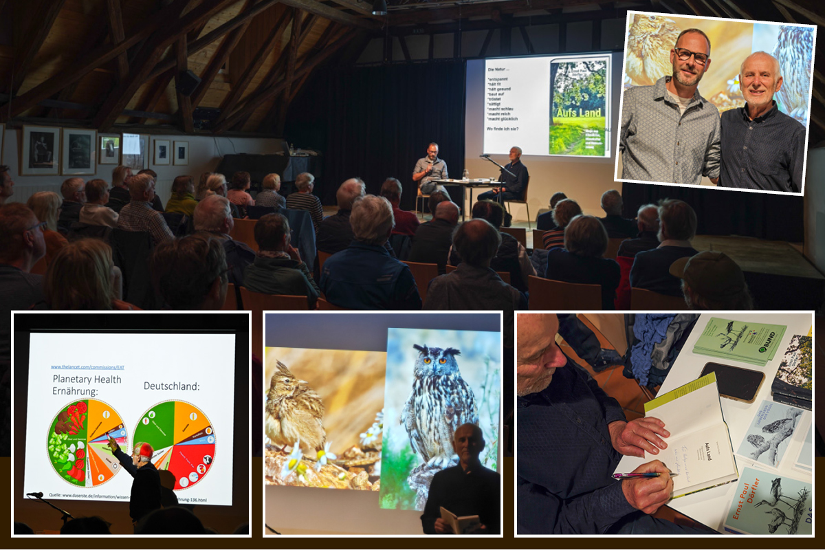 Obwohl Ernst Paul Dörfler, Umweltaktivist seit Jahrzehnten, mit deutlichen Worten den Klimawandel beschrieb und die Zuhörer aufforderte zum Schutz der Umwelt und der Natur ihren Teil beizutragen, war es auch ein amüsanter Abend im Pfleghof. Auf dem Land sieht Dörfler die Chance etwas fürs Klima zu tun. Dann das Land ist es, das die Städter ernährt. Als er auf neues Buch über das Liebesleben der Vögel zu sprechen kam, durfte das Publikum herzlich lachen, wenn er als Ornithologe die Eigenschaften der Vögel auf die Menschen übertrug.