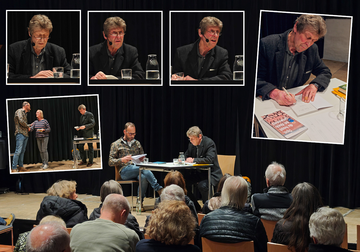 Sein neuer Roman „Ginsterburg“ ein paar Tage zuvor erschienen, nimmt uns mit in eine beschauliche Stadt im Reich, als die Nazis beginnen, das Leben vor Ort zu bestimmen. Er gewährte uns einen Einblick, skizzierte die Handlungsstränge und Personen. Ein dichter und atmosphärischer Roman in den Jahren 1935, 1940 und 1945. Beinahe wollte uns der Autor das ganze Personal vorstellen, er war kaum zu bremsen und die Zuhörer merkten, dass er noch ganz dicht an seinen Figuren dran ist. Ja, man kann schon ins Grübeln kommen, wenn man liest, wie schnell damals in dieser kleinen Stadt für viele die neue Zeit Schrecken und Verderben bringt, andere aber sehr schnell profitieren oder zu schweigenden Mitläufern werden. Ein tiefer Abgrund zieht sich durch die Stadt. Doch der Krieg macht auch vor Ginsterburg nicht Halt und eigentliche gibt es im Krieg immer nur Verlierer.