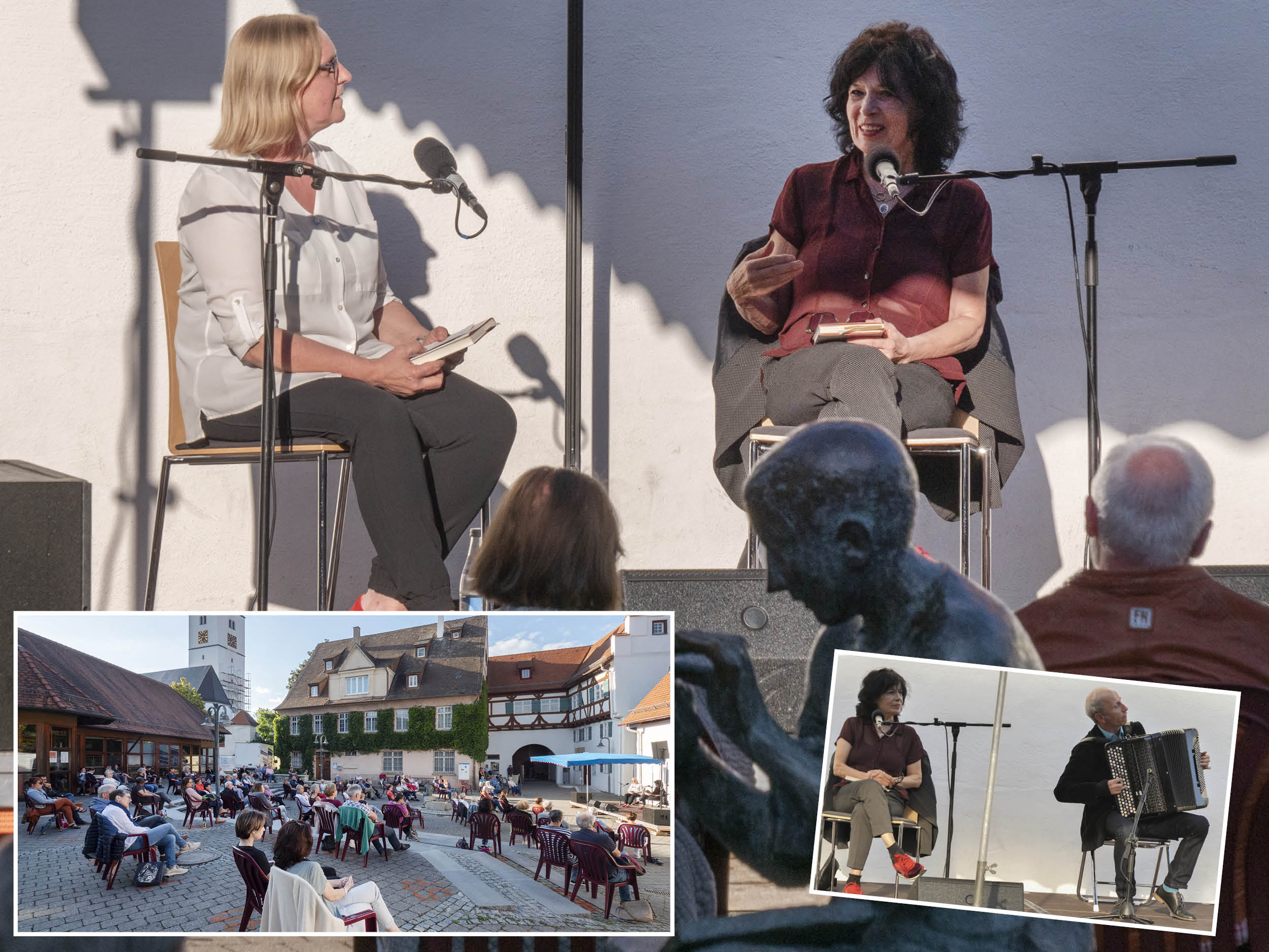 Freitag, 3. Juli 2020 – heute mussten wir nicht bangen. Für unsere Lesung mit Monika Helfer war uns der Himmel gewogen, und nicht nur das! Welch wunderbar rundes Zusammenspiel von Lesung, Moderation und Musik. In Peter Gerter am Akkordeon haben wir die musikalische Stimme der „Bagage“ hinzugewonnen. Wieder war die Veranstaltung ausverkauft und die Zuhörer/innen mit ihrem Blinddate vollauf zufrieden. Und wir haben nicht nur diesen Abend in uns wirken lassen, die Fahrt mit Monika Helfer nach Hohenems war wie ein kleiner Kurzurlaub!