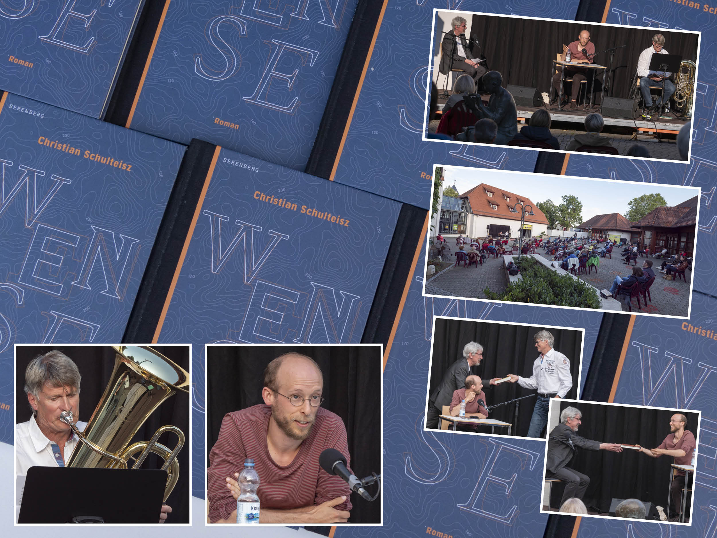 Freitag, 17. Juli 2020 - zum 5. Abend des Kultursommers traf die Literatur auf eine Tuba. Bestimmt hätte dies dem Universalgenie Jürgen von der Wense gefallen, versuchte er selbst doch auch als Komponist Fuß zu fassen. Wenses unstetes Leben in den letzten Kriegsjahren des Zweiten Weltkriegs ist das Thema des kleinen, feinen Romans von Christian Schultheisz, den dieser auf dem Pfleghof vorstellte. Und wie gesagt, Christoph Hesses Spiel an der Tuba und der Roman ergänzten sich bestens.