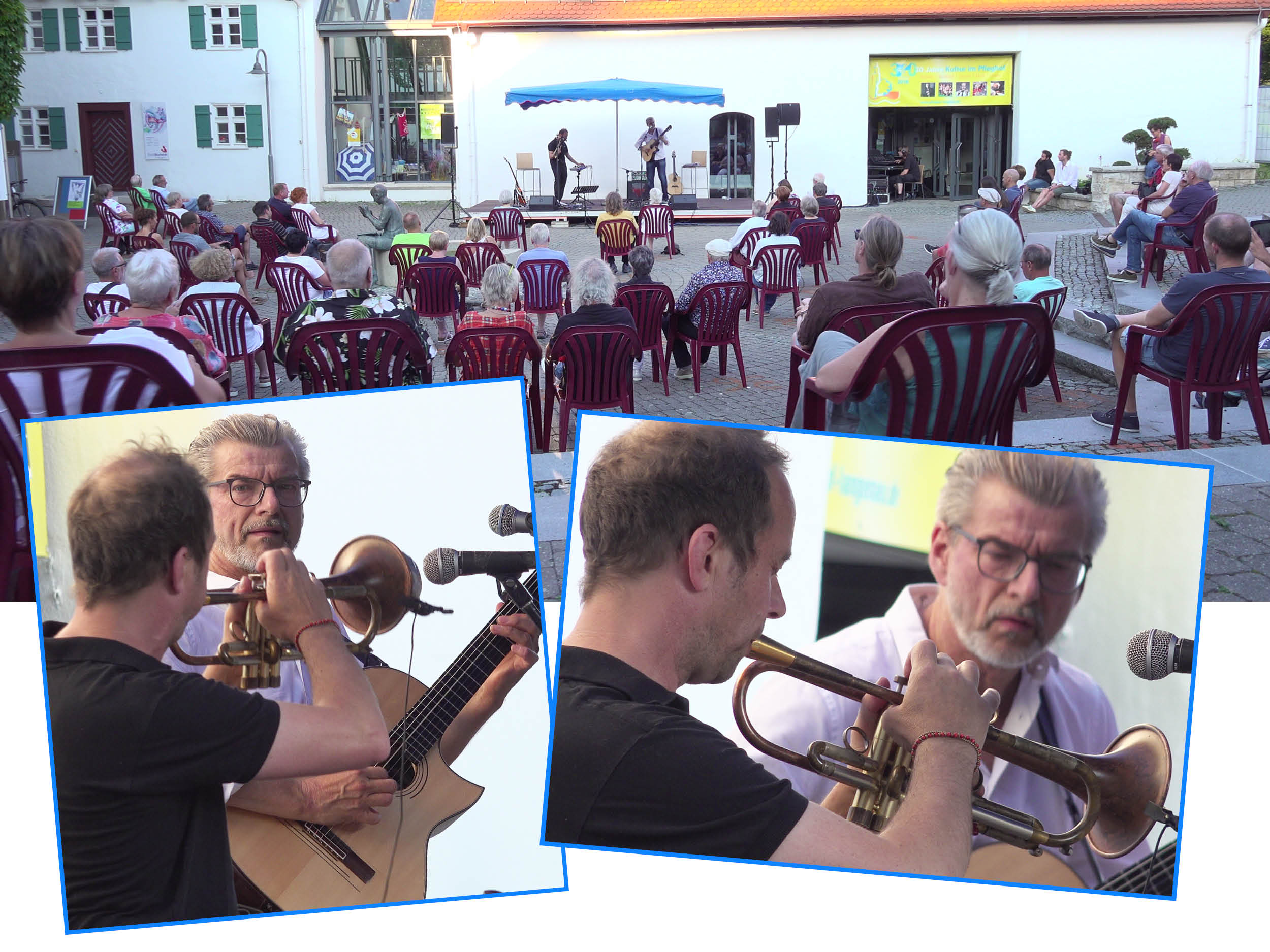 Was war das für ein außergewöhnlicher Abend auf dem Pfleghof. Das achte kulturelle „blind date“ unserer Sommerveranstaltungen brachte auf der Bühne eine Trompete und eine Gitarre zusammen. Die international bekannten Musiker Joo Kraus und Michael Koschorreck hatten sichtlich Freude an ihrem Auftritt und diese übertrug sich in Windeseile auf das Publikum. Mit ihrem einfühlsamen Jazz und ihrer Interpretation von Klassikern der Pop- und Rockgeschichte entstand eine beschwingte Atmosphäre, die die glücklichen Zuschauer in eine andere Welt katapultierte.