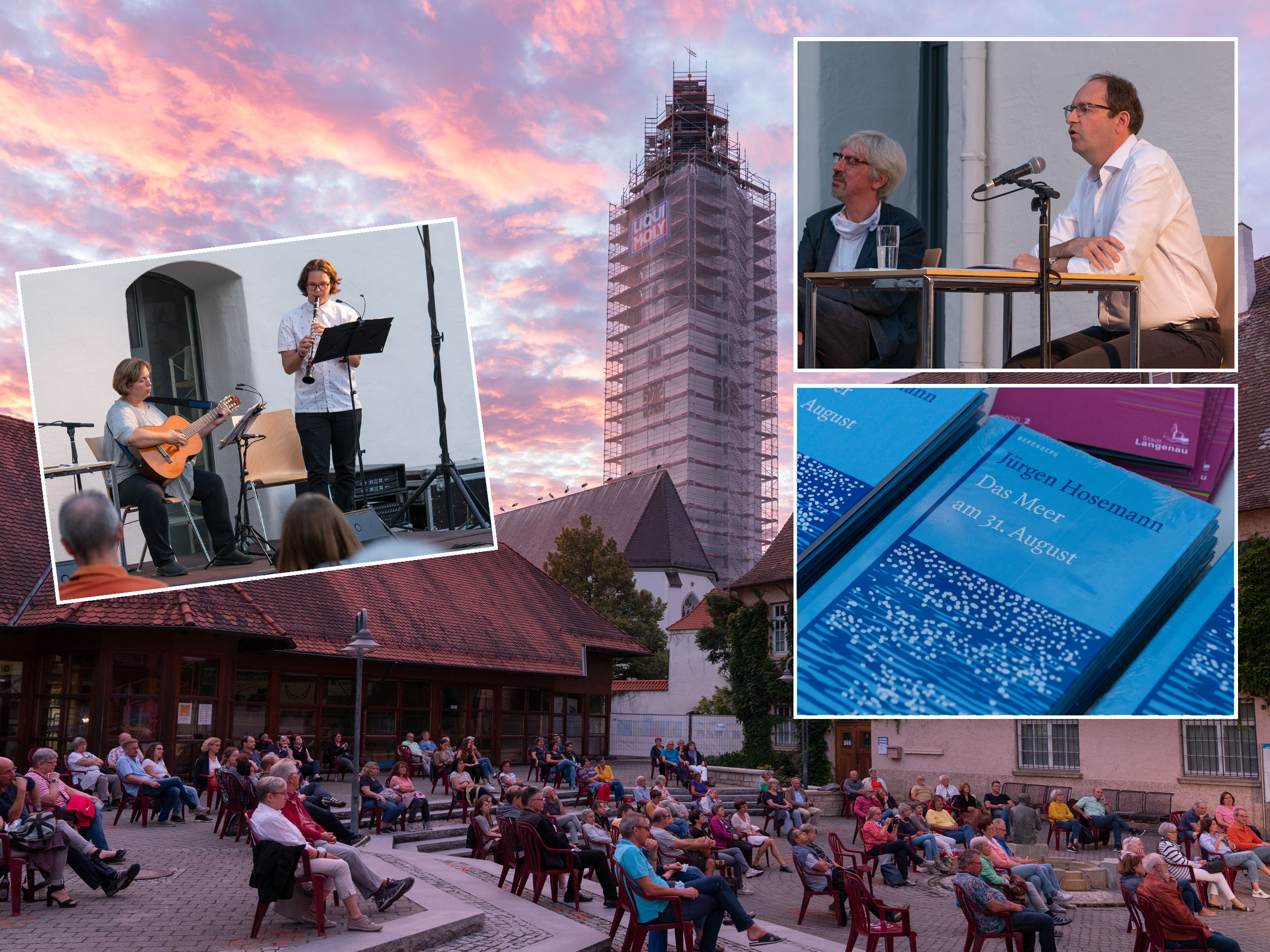 Der Himmel verabschiedete sich mit einem farbenprächtigen Schauspiel vom Langenauer Kultursommer. Auch die Störche verfolgten vom Kirchendach aus aufmerksam, wie Jürgen Hosemann sein neues Buch vor ausverkauftem Pfleghof vorstellte. Er erzählt darin nichts anderes als das Erlebnis eines Mannes, der am Strand von Grado einen Tag und eine Nacht verbrachte. „Das Meer am 31. August“ erzählt uns nichts Spektakuläres, aber der Autor - hauptberuflich Lektor - las so authentisch und eindringlich, dass sich die Zuhörer fragten, warum sie nicht längst selbst einmal dieses Abenteuer gewagt haben. Musikalisch umrahmt wurde dieser Meeresabend vom Duo Kern, Daniel an der Klarinette, begleitet an der Gitarre von seiner Mutter. Ein wunderbarer Abend und gleichzeitig ein schöner Ausklang des Sommer-Kultur-Festivals auf dem Pfleghof.