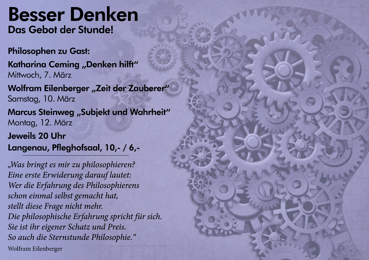 Nach der großen Resonanz der Reihen „besser leben“ und „besser wählen“ sind wir mutig geworden und haben uns an „besser denken“ gewagt. Mit drei Philosophieveranstaltungen vor unser Publikum zu treten, erschien uns sehr spannend - aber auch wagemutig. Was für eine Freude, dass auch diesmal unser Konzept aufging und die Zuhörer in den Pfleghofsaal strömten.