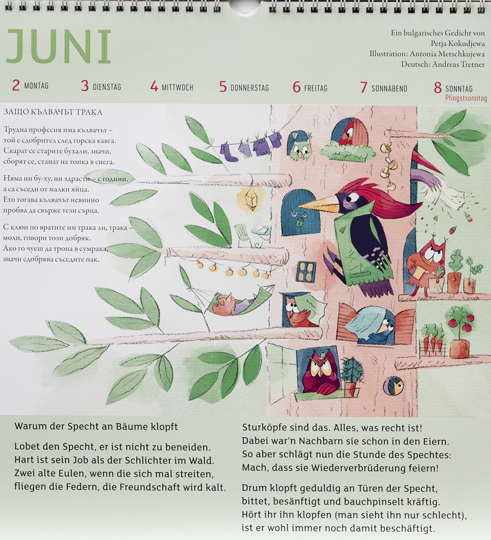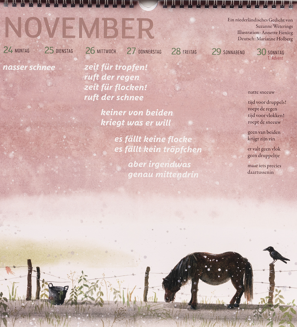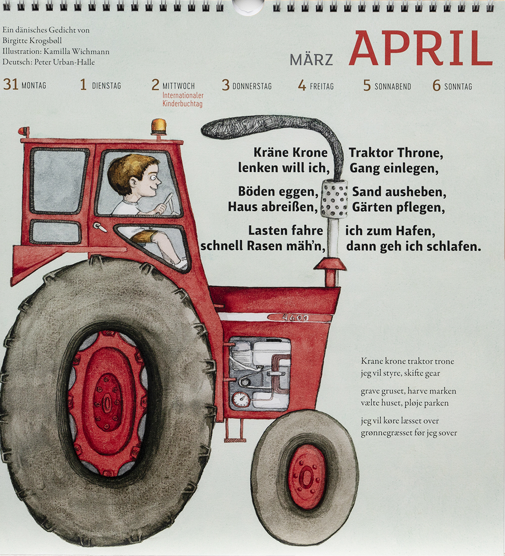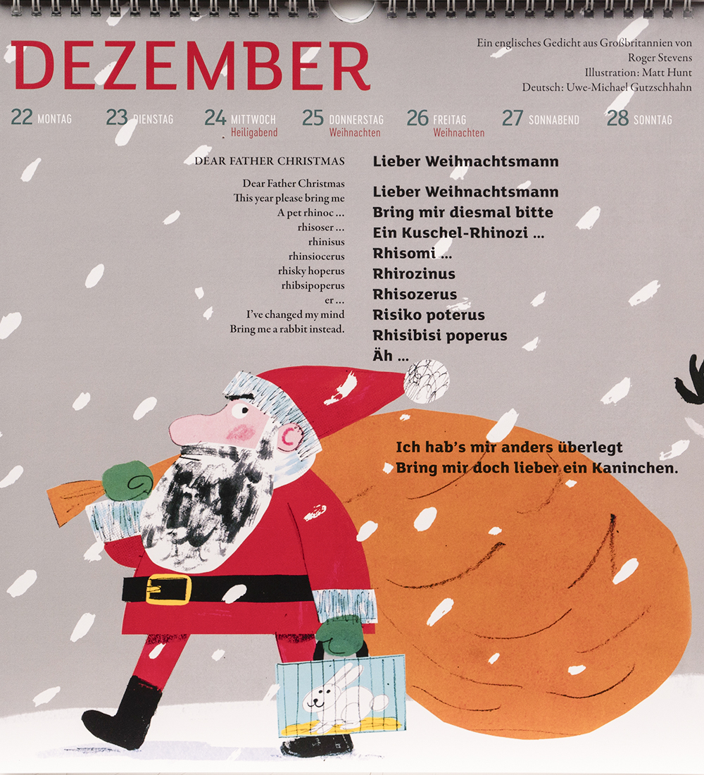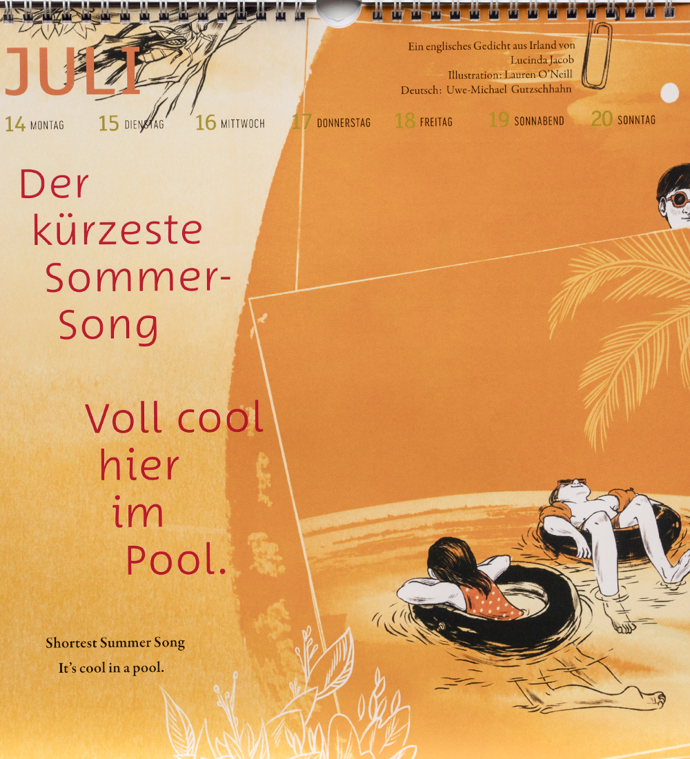 Er ist mehr wegzudenken, aus vielen Kinderzimmern, Schulen oder Kindergärten – denn seit über 10 Jahre begleitet dieser Kalender mit Gedichten und Bildern aus aller Welt nicht nur Kinder Woche für Woche durchs Jahr. Was ist das Besondere an diesem Kalender? Zu jedem Wochenanfang gibt es ein zweisprachiges Gedicht, mal heiter oder nachdenklich, gereimt oder nicht. Es regt an zum Vorlesen, zum Auswendiglernen, Ausprobieren der anderen Sprache, zum Träumen und Selberdichten. Wir lieben und verschenken diesen Kalender seit Jahren nicht nur an Kinder. Originalillustrationen umrahmen die Gedichte und machen jedes Blatt zu einem kleinen Kunstwerk.