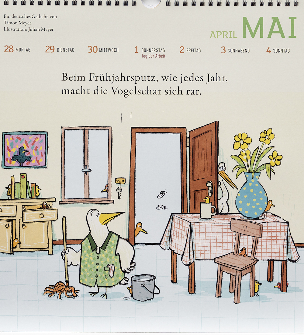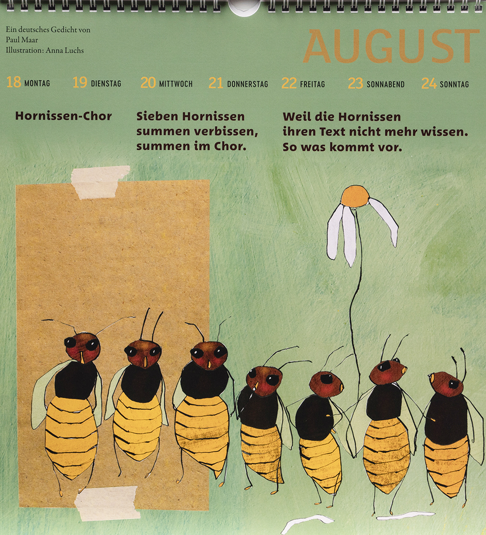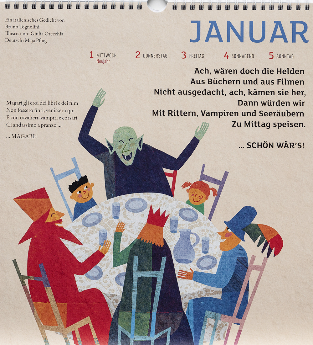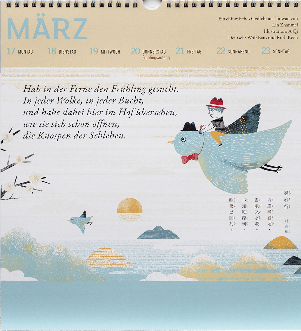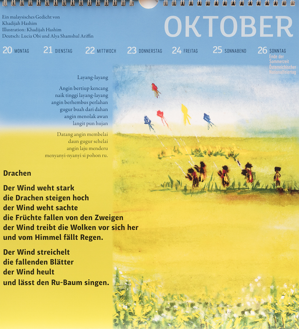 Er ist mehr wegzudenken, aus vielen Kinderzimmern, Schulen oder Kindergärten – denn seit über 10 Jahre begleitet dieser Kalender mit Gedichten und Bildern aus aller Welt nicht nur Kinder Woche für Woche durchs Jahr. Was ist das Besondere an diesem Kalender? Zu jedem Wochenanfang gibt es ein zweisprachiges Gedicht, mal heiter oder nachdenklich, gereimt oder nicht. Es regt an zum Vorlesen, zum Auswendiglernen, Ausprobieren der anderen Sprache, zum Träumen und Selberdichten. Wir lieben und verschenken diesen Kalender seit Jahren nicht nur an Kinder. Originalillustrationen umrahmen die Gedichte und machen jedes Blatt zu einem kleinen Kunstwerk.